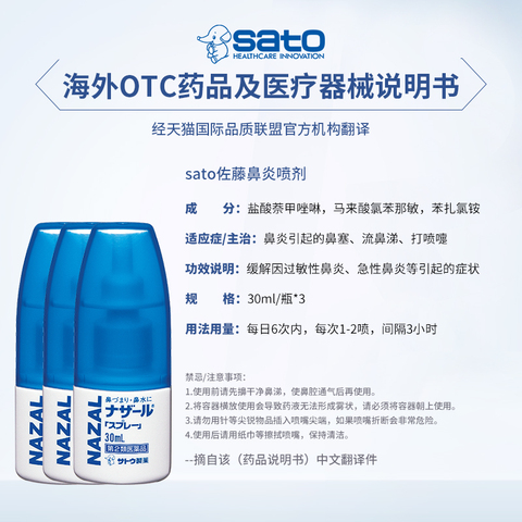 sato佐藤鼻炎喷雾30ml*3瓶SATO鼻炎喷雾日本喷剂鼻喷进口药房通鼻