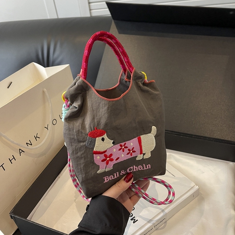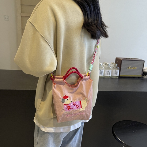 日系刺绣可爱腊肠狗水桶包包女2025新款手机包百搭通勤单肩斜挎包