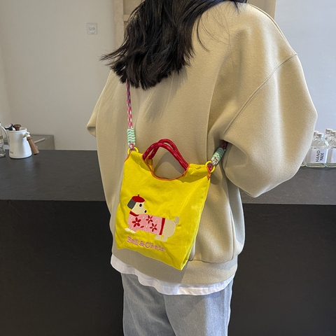 日系刺绣可爱腊肠狗水桶包斜挎包