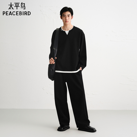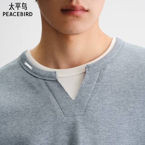 太平鸟男装撞色T恤亨利领重磅长袖衫阔版假两件宽松打底衫老钱风
