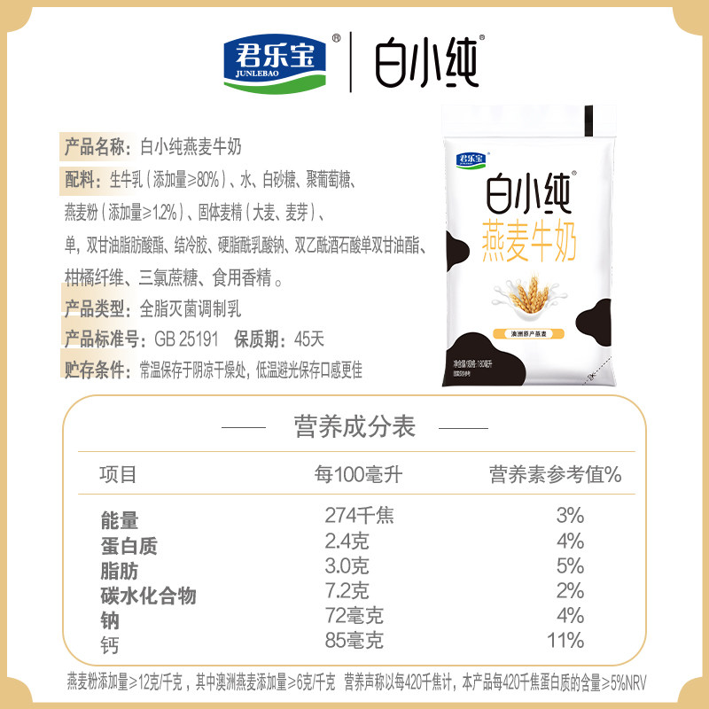 【商超同款】君乐宝白小纯燕麦牛奶蛋白质,燕麦奶香浓郁清甜,口感好,配料干净,拒绝添加,大人孩子都喜欢喝!营养均衡配比,代餐、健身补水、日常解馋一站搞定!