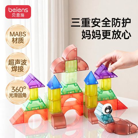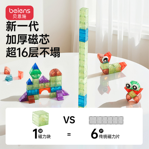 贝恩施磁力块:让孩子的想象力,磁力全开!”采用食品级ABS材质,无味无毒,通过国际安全认证,宝宝啃咬也不怕。圆角设计+磁力缓冲技术,避免夹手风险,玩得开心更安心。