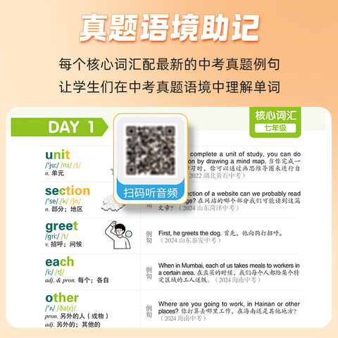 ;覆盖核心词汇1200个,简单词汇350个,常考短语400个。每个核心词汇配新的中考真题例句让学生们在中考真题语境中理解单词。扫码即可听准确发音背单词练听力一举两得。与新教材同步,覆盖了初中阶段所