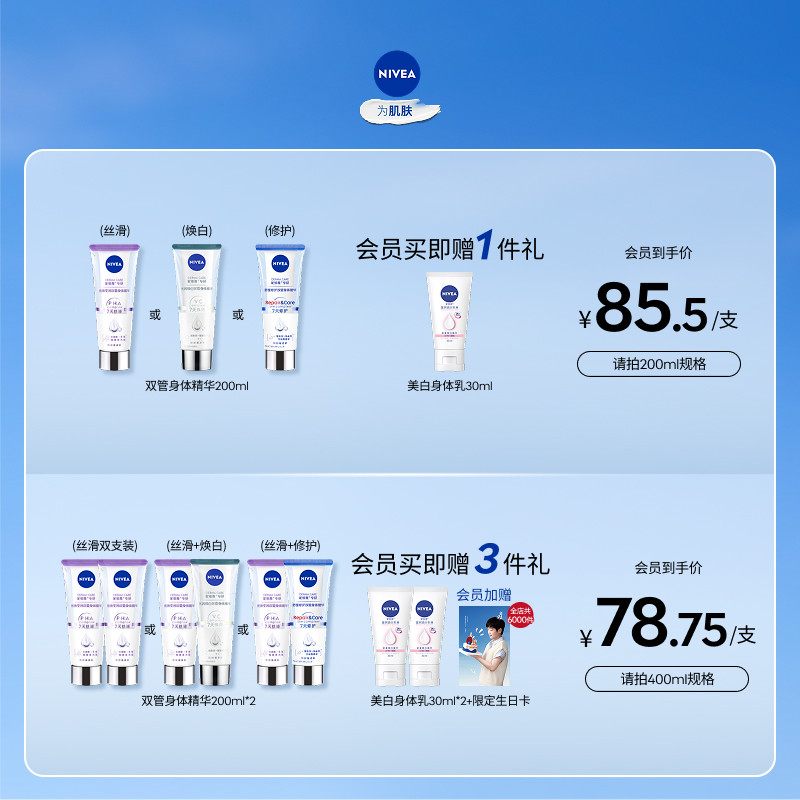 一半乳液深滋润,养出丝滑肌,全新妮维雅双管身体精华乳,温和有效解决肌肤粗糙问题。深入维稳,强韧屏障促进有效成分吸收。