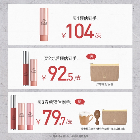 【直播间限时立减】3CE好气色润唇膏 裸色镜面唇釉口红滋润礼物 【售价】:¥238.00 【券后】:¥175.00 【优惠券】:¥63 推荐理由:【拍2件175元,送摩卡棕拼色灯芯绒化妆包,。叠4元金币预估171到手2件。叠消费券后预估149.6元,单件74.8元】3CE好气色润唇膏,滋润显色,打造自然好气色!拍3支仅需198元,每支仅66元, 👉复制这条信息97¥ HU071 9aFmUBYLBz9¥ 打开【手机淘宝APP】即可领券购买:/
