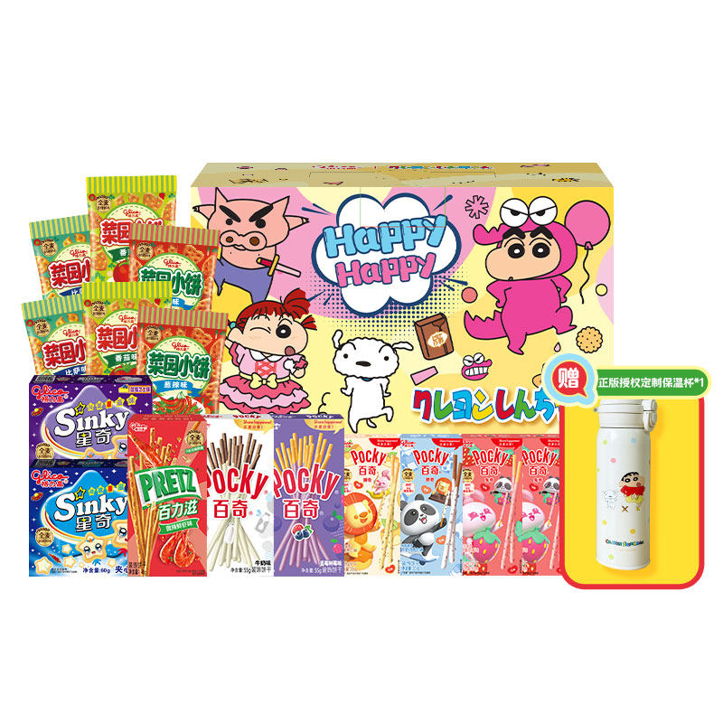 格力高饼干礼包/蜡笔小新礼盒休闲儿童零食赠手提行李箱保温杯