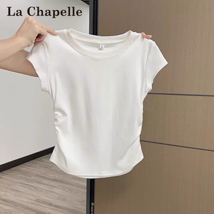 拉夏贝尔白色正肩短袖T恤女夏季2026新款圆领小飞袖抽褶收腰上衣